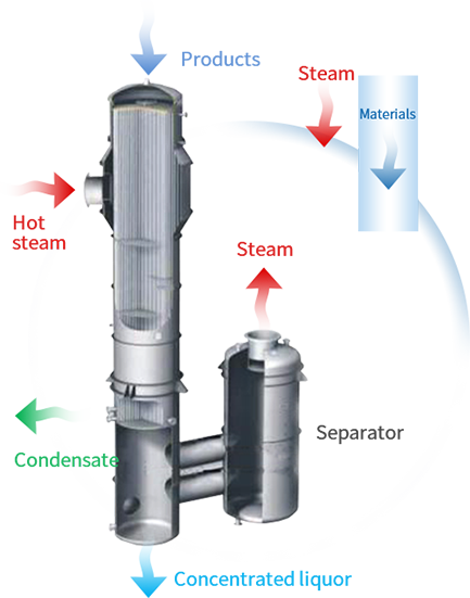 The Falling Film Evaporator features a large concentration ratio, wide viscosity range, very low to negligible pressure drop, excellent heat transfer coefficient, large treatment capacity etc. It is widely used in the petrochemical plants for production of glycol, ethanolamine, caprolactam, styrene, alkylphenol, acrylic fiber, polyester, chlor alkali, polycarbonate, and water treatment as well as in the light and food industry.